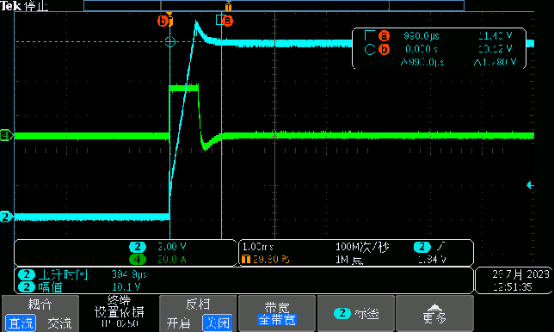 某款設備,設定電壓:0V升到10V,帶0.5Ω負載,測試設備突然帶載能力。實測電壓波形和電流波形過沖嚴重,超過幅度的50%。這種過沖可能會導致試品損壞。