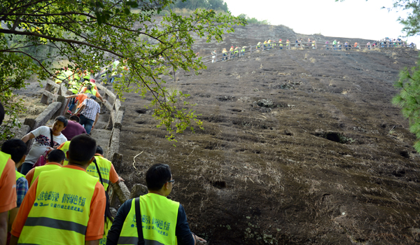 最后一天,我們來到四壁陡峭的虎嘯巖, “登山不觀景,觀景不登山”在虎嘯巖的攀爬過程中得到了最好的驗證,一條人工開鑿的小徑,一邊陡峭的山崖,一邊是幽深的山谷。腳下臺階長不過半米,寬不過一個腳掌。一路延伸,幾乎沒有一個平坦的臺階。借著昨天登山的勁頭,大家一鼓作氣登上虎嘯巖觀景臺,欣賞著四周環繞的美景,不得不感嘆大自然的鬼斧神工。